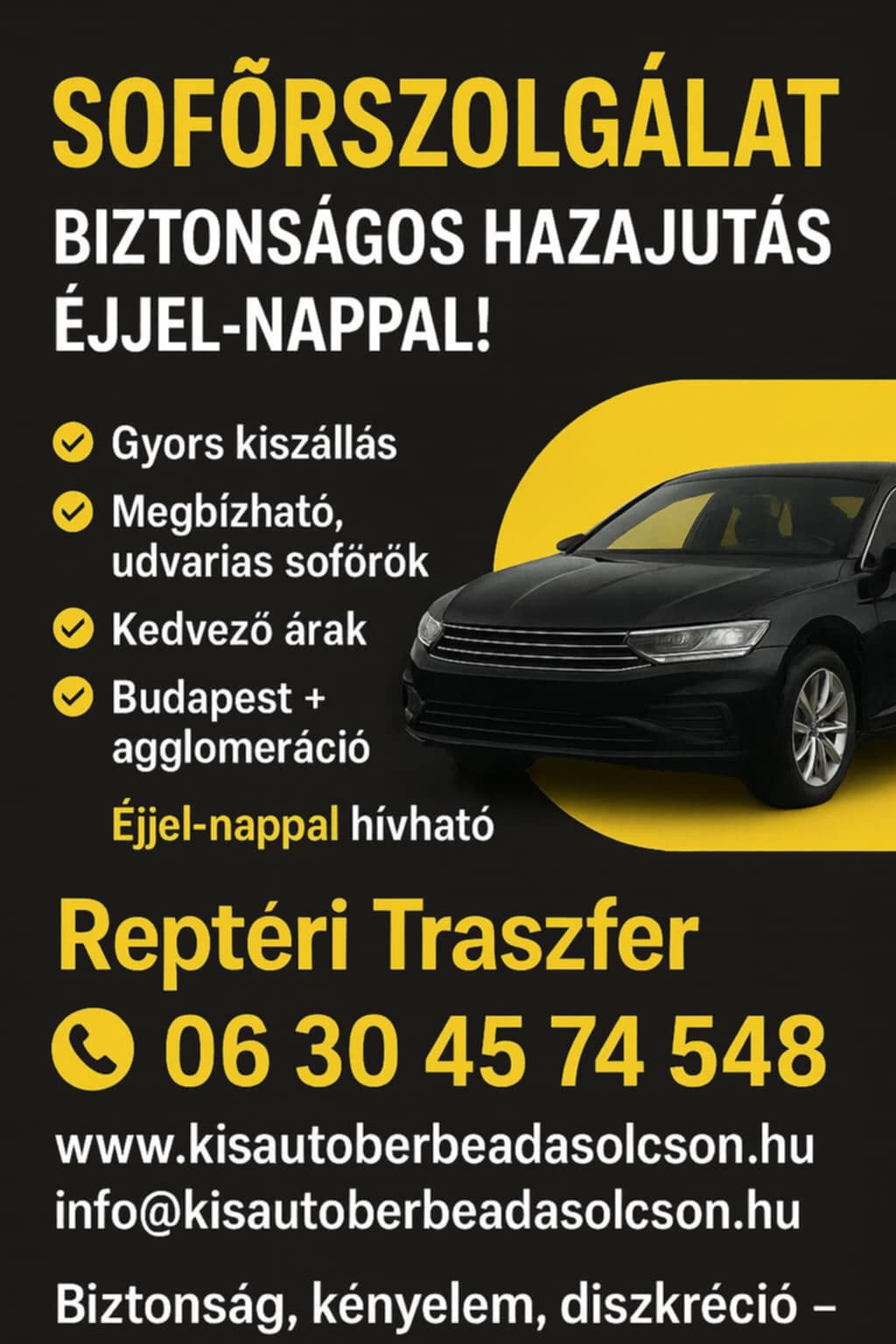 Sofőrszolgálat – Biztonságos hazajutás, saját autóval A Kisautó Bérbeadás Olcsón sofőrszolgálata azért jött létre, hogy bármilyen helyzetben biztonságosan, gyorsan és kényelmesen hazajuttassuk Önt és autóját. Legyen szó egy esti buliról, családi összejövetelről, vacsoráról, céges rendezvényről vagy bármilyen alkalomról, amikor Ön nem szeretne vagy nem tud vezetni – ránk mindig számíthat. Miért válassza sofőrszolgálatunkat? Biztonság mindenek felett Nálunk a legfontosabb az Ön és autója épsége. Tapasztalt sofőrjeink pontosan, magabiztosan és körültekintően vezetnek. Ön nyugodtan pihenhet az út során, tudva, hogy minden a legnagyobb rendben zajlik. Gyors kiérkezés, rugalmas rendelkezésre állás Szolgáltatásunk a hét minden napján elérhető. Ha azonnali segítség kell, vagy előre szeretné lefoglalni a hazautat, rugalmasan alkalmazkodunk az igényekhez. Saját autóval viszünk haza Nem kell ott hagynia az autót a város másik felén. Sofőrünk az Ön járművével juttatja haza, így másnap nem kell visszamenni érte. Kedvező, előre kalkulálható árak Árainkat átláthatóan és korrekten alakítottuk ki. Nincs rejtett költség, kiszámítható díjak alapján dolgozunk – így pontosan tudhatja, mennyibe kerül a hazajutás. Diszkrét és udvarias sofőrök Munkatársaink nemcsak jól vezetnek, de kommunikációban és ügyfélkezelésben is kiemelkedőek. Kulturált, ápolt megjelenés és maximális diszkréció minden ügyfelünk számára garantált. --- Kinek ajánljuk sofőrszolgálatunkat? Akik éjszakai szórakozás után biztonságosan szeretnének hazajutni Céges rendezvények résztvevőinek Étteremből, bárból, esküvőről távozóknak Bárkinek, aki elfáradt, rosszul lett vagy egyszerűen nem szeretne vezetni Idősebb vagy bizonytalanabb sofőröknek, akik alkalomszerű segítséget kérnének Akár egy hosszabb utazás végén is, amikor Ön már kimerült --- Hogyan működik a sofőrszolgálat? 1. Hívjon minket telefonon Megadja a kiindulási címet és a célállomást. 2. Sofőrünk rövid időn belül megérkezik Udvariasan bemutatkozik, és szükség esetén segít eligazodni. 3. Saját autójával hazaviszi Önt Ön kényelmesen hátradől, sofőrünk pedig biztonságosan vezet. 4. A helyszínen történik a fizetés Áraink előre egyeztethetőek, így nincsenek meglepetések. --- Miért fontos a sofőrszolgálat? A túlzott alkoholfogyasztás, a fáradtság vagy akár egy rosszullét is komoly veszélyt jelenthet a volán mögött. A sofőrszolgálat a legbiztonságosabb, legésszerűbb és egyben legkényelmesebb megoldás arra, hogy Ön és autója is épségben hazaérjen. Egy baleset vagy vezetés közbeni szabálysértés sokkal többe kerülhet, mint egy egyszerű sofőrszolgálati díj. --- Kapcsolat és rendelés Hívjon minket: [06304574548] Kisautó Bérbeadás Olcsón & Sofőrszolgálat www.kisautoberbeadasolcson.hu.